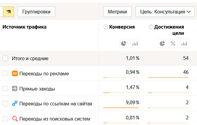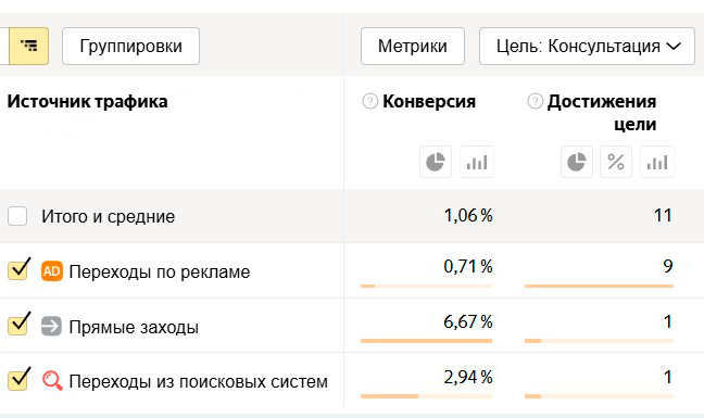 Что касается рекламы, то тут был ещё вопрос по ретаргетингу. По стандарту его надо делать и запускать. Это рекомендация от самого Яндекса. Но если мы возьмём любую конверсию, например "Консультация", то получим данные по ней вот такие: