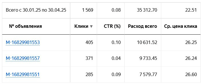 Теперь забегу вперёд и сразу покажу информацию по объявлениям за весь период, которые показали практически одинаковый результат:
