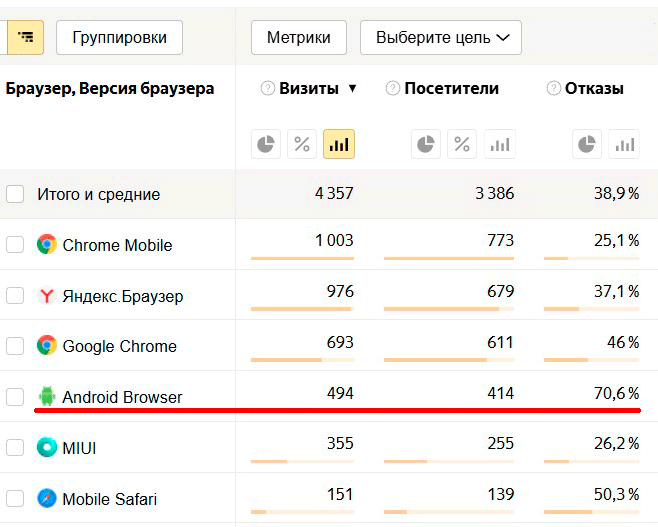 Здесь мы видим, что аудитория с Андройд Браузера именно имеет самый высокий показатель отказов (чем ниже отказы - тем лучше). При этом в этой нише в целом, относительно небольшая доля iOS (Safari), поэтому просто отключить эту аудиторию нельзя, приходится прибегать к различным хитростям.