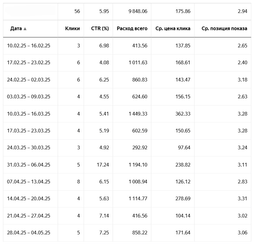 Кампании в РСЯ работали на оплате за конверсии. Т.к. конверсий по ним не было, то оплата не была списана, поэтому в графе затрат стоит ноль. По поисковой кампании так сделать было нельзя (точнее, технически можно, но на практике это бы не работало) и нужно было понять стоимость клика для расчёта экономики в этой нише. Клик на поиске получился 152 рубля. Это не самая высокая стоимость, бывает дороже, вопрос тут в том, какой у нас средний заказ. Экономику мы ещё обсудим чуть ниже.