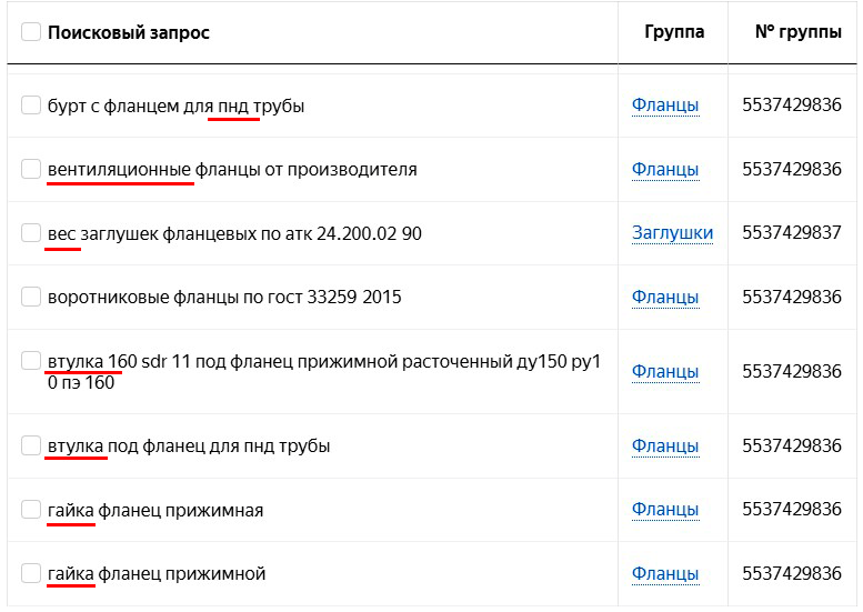 Здесь красным подчёркнуты нелецевые запросы по фланцам.