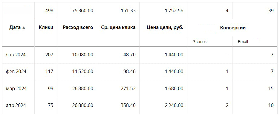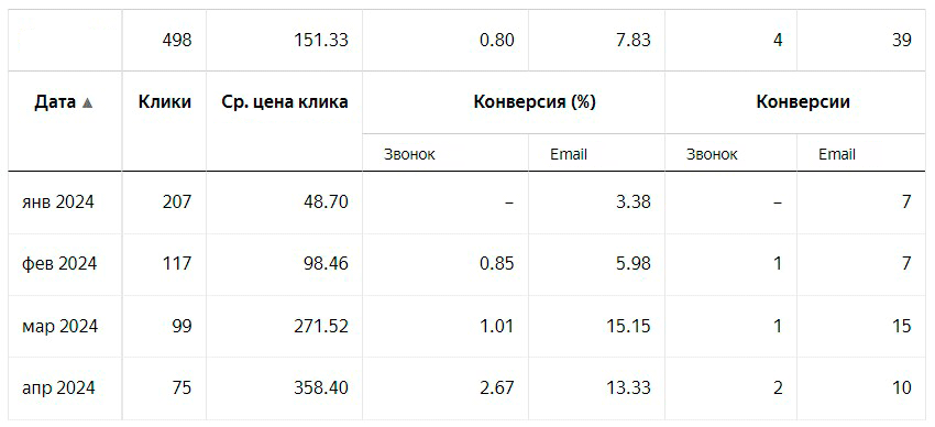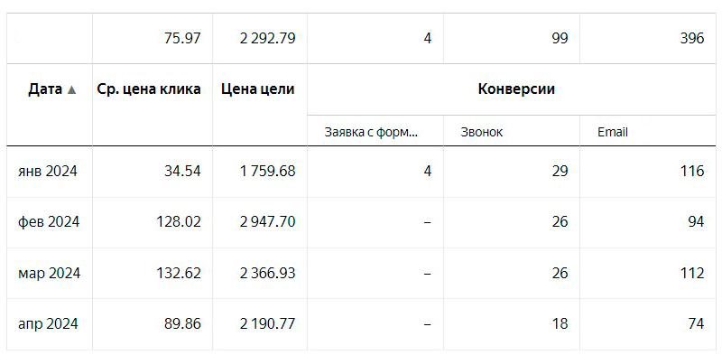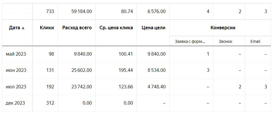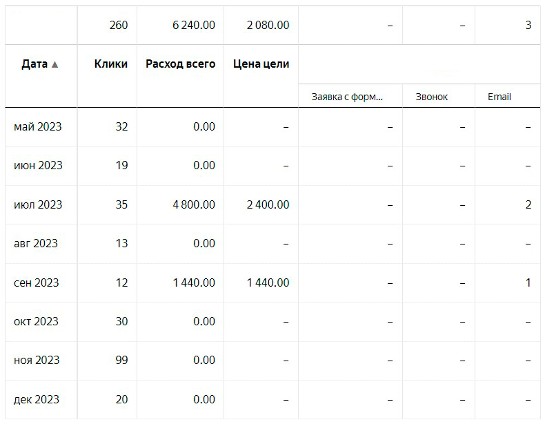 Достижение этих целей указано в таблицах ниже. Конечно, были и повторные заказы, были заявки с других источников (SEO, доски объявлений), но у этого предприятия большую долю занимал канал платной рекламы (Яндекс Директ). В целом всё работало, но хотелось улучшить показатели рекламы, детальнее разобраться в аналитике.