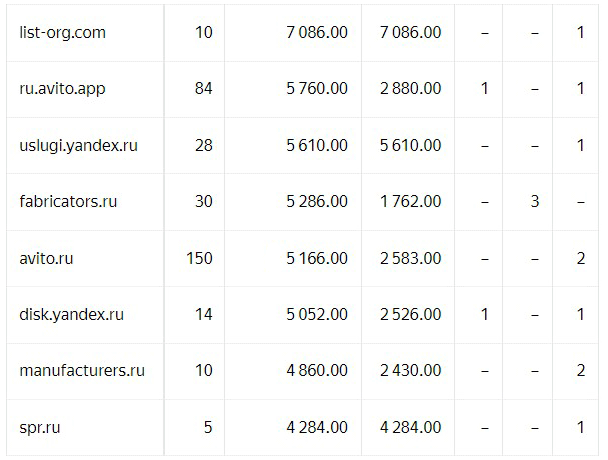 Слева направо указаны: название площадки, клики, расход по площадке, цена цели. 3 правые столбца это конверсии. По результатам анализа были отключены часть самых дорогих площадок.
