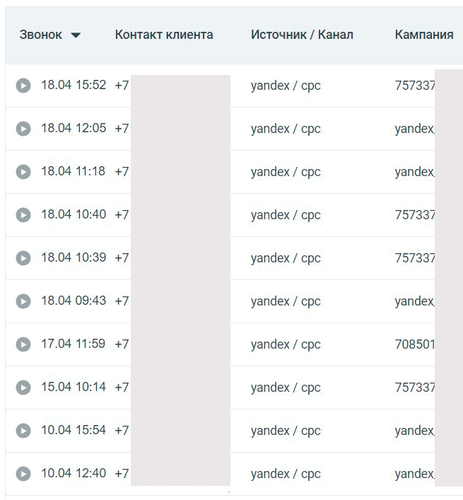 Телефоны реальных клиентов и полные названия кампаний я скрыл. Проанализировав заявки (обращения) мы выявили несколько рекламных кампаний с которых приходят самые интересные заказы и кампании с которых много частников. Последние были остановлены.