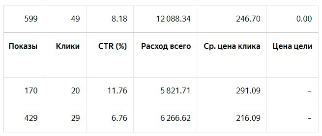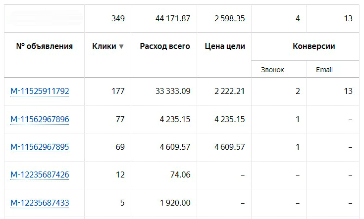Полный текст объявлений и картинки тут не привожу, чтобы нельзя было идентифицировать заказчика, т.к. выше были финансовые данные. Под этими номерами скрыты самые эффективные тексты и заголовки. Видно, что первое объявление самое эффективное, а вторые 2 наоборот, намного хуже.